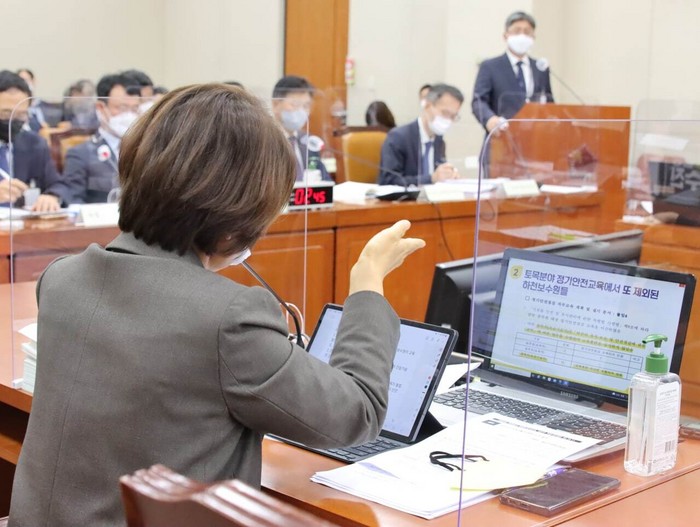 이 의원은 "영산강유역환경청에 국가하천 및 시설물 안전점검과 유지·보수를 하는 '하천보수원'들이 있는데 하천보수원 중 초급기술자는 공무원과 똑같이 정기안전점검 직무교육을 받아야하는데 실제 교육에서 제외됐다."고 지적했다.