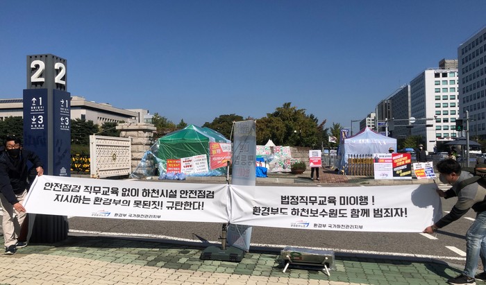 이들이 든 현수막에는 "안전점검 직무교육 없이 하천시설 안전점검 지시하는 환경부의 못된 짓, 규탄한다."고 새겨졌다. 또 한 쪽 현수막 글내용은 '법정직무교육 미이행, 환경부도 하천보수원도 함께 범죄자'라고 억울함을 호소했다.