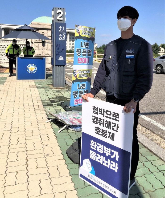 이날 국회 정문 앞에서는 금강물환경연구소 김정환 지회장이 1인 피켓 시위했다. 그는 "오늘 국정감사라고 국회의원들이 알아야 한다는 심정으로 이렇게 나왔다."고 말했다.