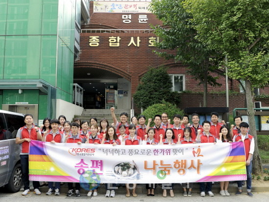 ▲한국광물자원공사 직원들이 명륜종합사회복지관 앞에서 한가위 송편나눔에 앞서 기념촬영을 하고 있다. |