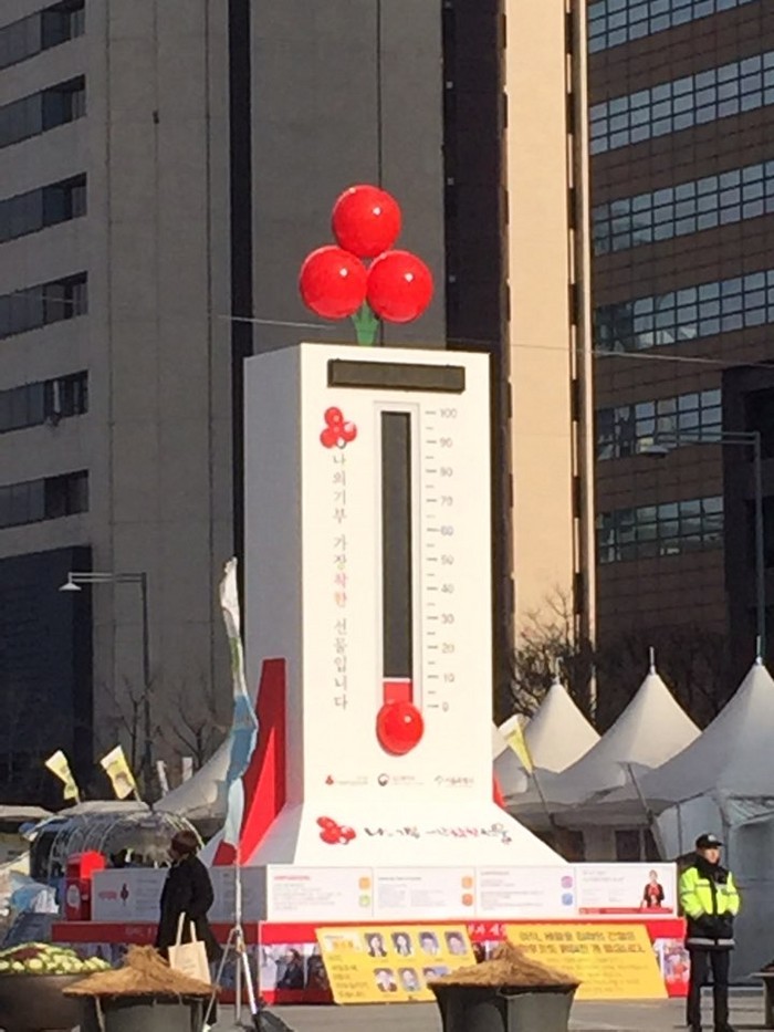 지난달 21일부터 설치된 서울 광화문광장 충무공 이순신 장군 동상 앞에 설치된 사랑의 온도탑이 침체된 사회전반의 분위기 만큼 냉랭하다.