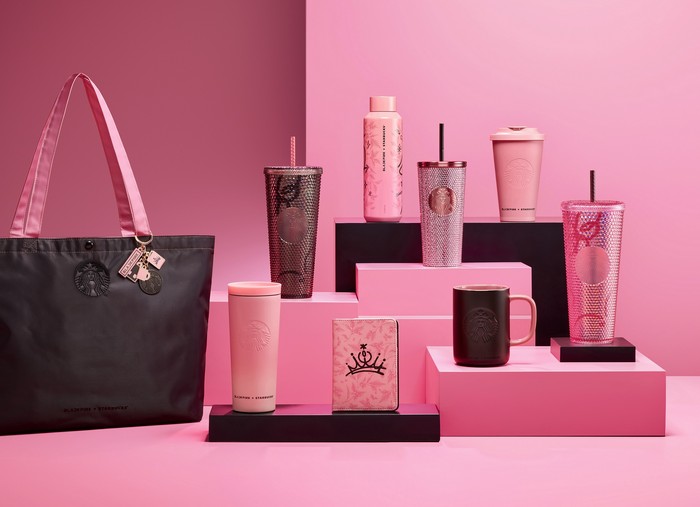 이달 25일부터 한정 기간 동안 판매되는 블랙핑크 콜라보레이션 상품들은 블랙핑크를 테마로 기획한 프라푸치노 음료와 푸드를 포함해 스타일리시한 디자인의 MD, 스타벅스 카드 등으로 구성됐다.