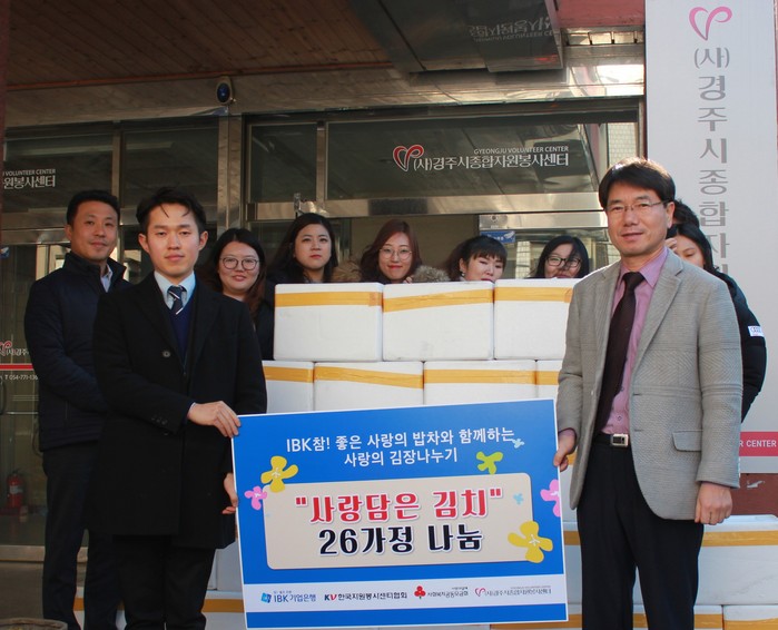 이날 김장나누기 사업은 IBK기업은행과 한국자원봉사센터협회가 주관하고 사회복지공동모금회가 후원하는 행사로, 김장김치 26상자(10kg)를 경주시드림스타트와 연계, 지역 내 아동가정 및 저소득층 청소년 26세대에 읍면동 친절한 경자씨를 통해 직접 전달했다.