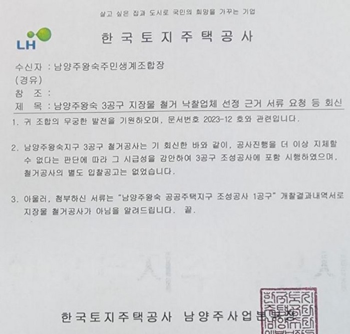 LH남양주 3공구 지장물 철거 26억원 국가계약법 위반