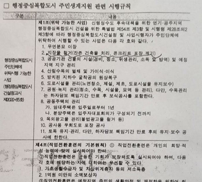 국토부가 특별법, 시행규칙을 제정하지 않았다는 근거로 LH공사는 상위법령 등 위반소지가 있는 지장물 철거(건설폐기물 처리), 수목 벌채 등을 입찰공고 하고 있는 실정이다.