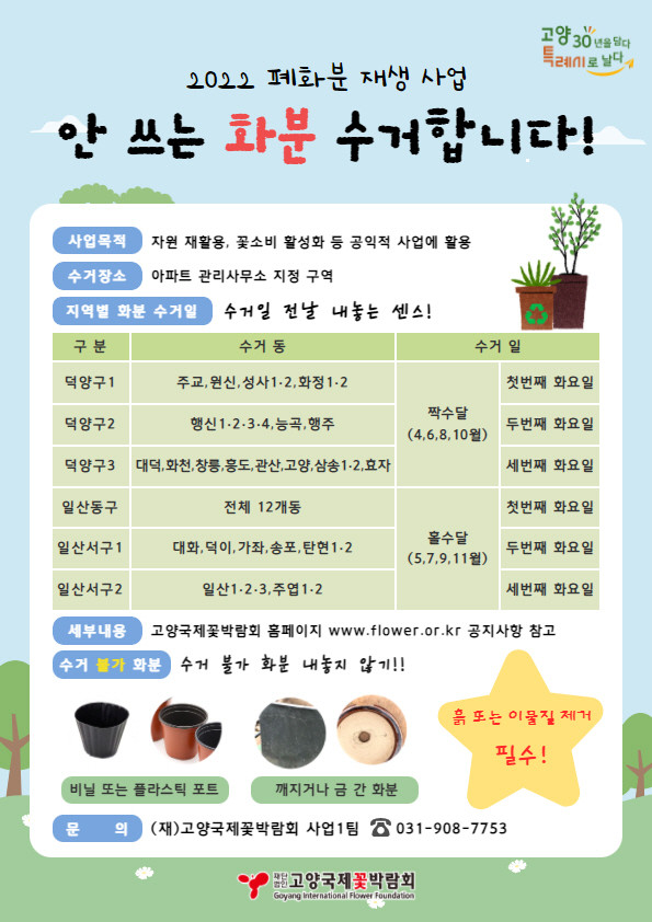 꽃, 화훼의 고장인 고양특례시는 (재)고양국제꽃박람회와 함께 4월부터 11월 말까지 고양시 전역의 폐화분을 순차적으로 수거해 다양한 공익적 사업에 활용하는 '폐화분 재생사업'을 실시한다고 밝혔다.