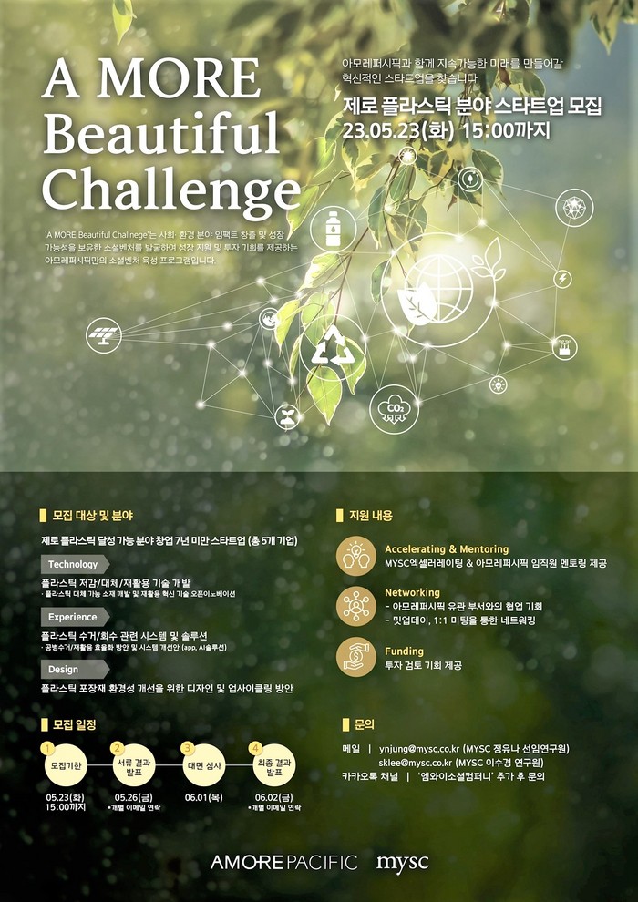 아모레퍼시픽이 주관하고 임팩트 투자사 엠와이소셜컴퍼니(MYSC)가 운영하는 'A MORE Beautiful Challenge'는 환경·사회 분야 스타트업을 발굴하여 아모레퍼시픽과의 협업 및 투자를 연계하는 프로그램으로 올해 2년 차를 맞이했다.