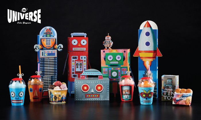 'DD UNIVERSE'는 지난해 '2018 레드닷 디자인 어워드' 본상에 이은 두 번째 수상으로, 일러스트레이터 에릭 조이너(Eric Joyner)와의 협업을 통해 로봇과 도넛의 이색적인 만남을 표현했다.