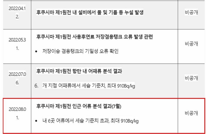7월 검사 결과를 보면, 20km권의 총 87곳에서의 어류가 모두 기준치 이하로 검출됐지만, 항만 내에서는 35곳 중 6곳의 어류에서 세슘 기준치를 초과한 것으로 분석됐다. 이 결과는 비공개 지정됐다.