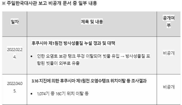 박 의원이 확보한 주일대사관의 후쿠시마 원전 관련 동향 보고 목록(1월~8월)을 보면, 총 163건의 공문서 중 94건이 비공개 지정된 것으로 나타났다. 약 58%의 동향보고 공문서가 비공개 지정된 것이다.