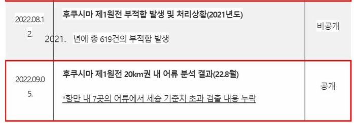 그런데 8월 검사 결과를 보면, 방사성물질이 검출되지 않은 20km권 내의 결과만 담고, 항만 내의 검사 결과는 누락돼 있다.