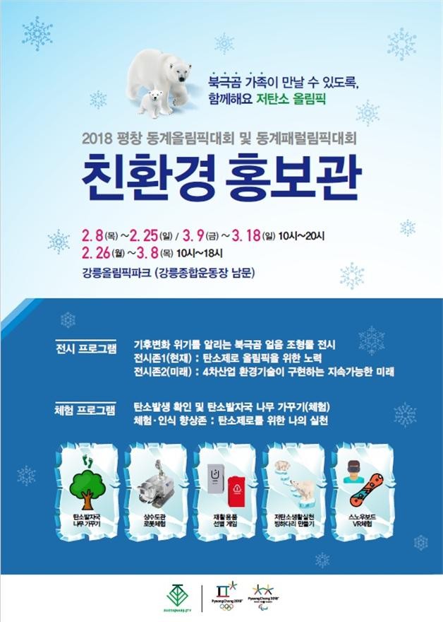 동계올림픽조직위원회는 6일 성공적인 저탄소 올림픽을 홍보하기 위해 2월 8일부터 동계패럴림픽대회 폐막일인 3월 18일까지 강릉올림픽파크에서 친환경 홍보관을 운영한다고 밝혔다.