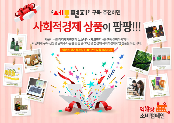 센터는 이 캠페인의 일환으로 16일(금)까지 서울시 사회적경제 기업과 상품 소식을 전하는 '세모편지'이메일 뉴스레터 구독 이벤트를 진행한다.