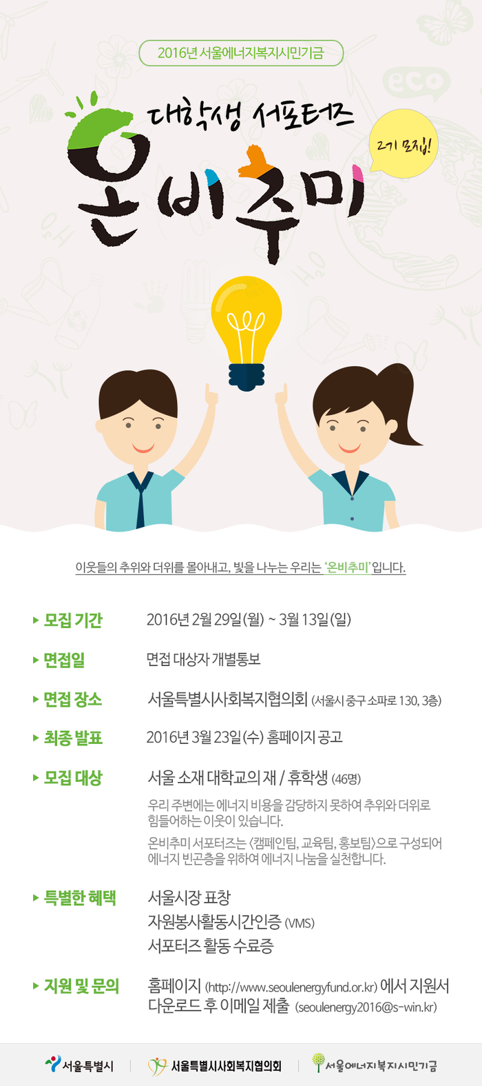 [환경데일리 이은수 기자] 서울에너지복지시민기금 대학생 서포터즈 온비추미는 온 세상을 밝게 비추다라는 의미다.