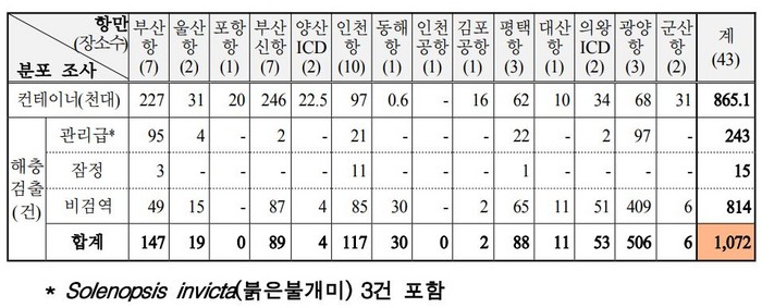 항만과 공항의 컨테이너 외관과 적재장소들을 점검한 결과, 2021년 1072건에서 2022년 2871건으로 외래병해충 발견이 3배가량 폭증했다.