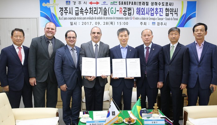 경주시는 28일 에코물센터 맑은물연구동에서 강철구 경주부시장과 브라질 파라나주 상하수도공사(SANEPAR)의 모우니르 차오위체(Mounir Chaowiche) 대표이사 등 관계자 12명이 참석한 가운데, 경주급속수처리기술(GJ-R공법)의 해외사업 및 공동연구 프로젝트 추진을 위한 양해각서(MOU)를 체결했다.