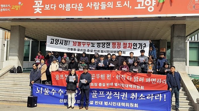 20일 오전 고양시청사 앞에서 산황동 골프장반대 시민범대위는 올해들어 두 번째 기자회견을 통해 "골프장 직권 취소해야 한다."고 압박을 가했다.
