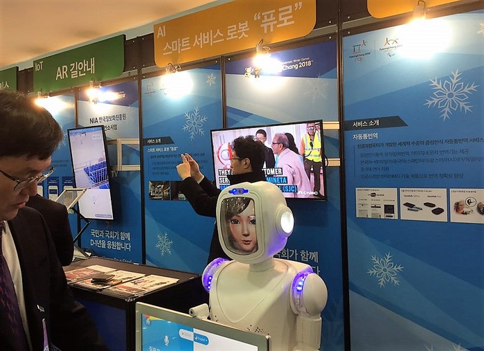 AI 기능을 더한 서비스 로봇 '퓨로'는 올림픽 방문객이나 관광객에게 질문을 하면 곧바로 답변을 해주는 음성인식으로 길안내를 비롯 각종 이벤트 홍보를 할 수 있는 시연을 해 인기를 끌었다.