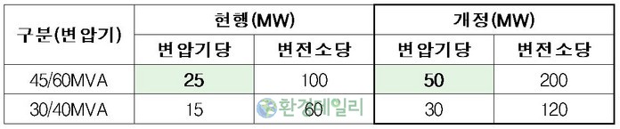 한전은 이러한 접속대기 문제를 해소하고자 변전소 변압기 1대당 접속하는 발전기 용량 한도를 아래와 같이 2배로 확대하기로 했다.