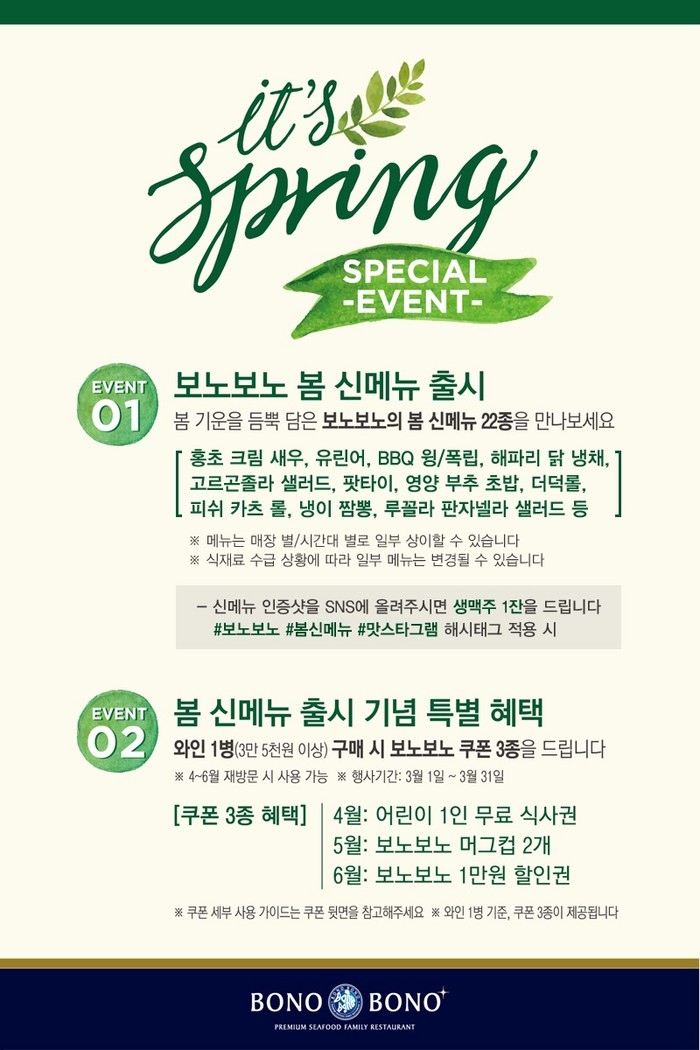 봄 신메뉴 출시 기념으로 31일까지 와인 주문 고객을 대상으로 쿠폰북을 제공하며 4~6월 재방문 시 월별로 어린이 1인 무료, 보노보노 머그컵 증정, 1만원 금액 이용의 혜택이 들어있다. 봄 신메뉴 이용 후 인증샷을 SNS에 올린 고객에게 무료 맥주 1잔도 제공한다.