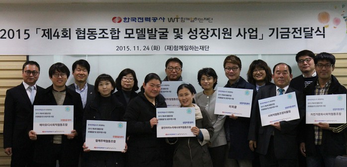 한전의 사회적협동조합 지원사업은 정부 3.0의 핵심 국정과제인 일자리 창출에 기여하고자 소규모 협동조합의 비즈니스 모델을 발굴하고, 경영자금 지원을 통한 경쟁력 강화를 목적으로 시행하며, 9월 25일 함께일하는재단과 업무협약을 체결하고 서류심사와 현장실사를 거쳐 지원대상을 최종 선정했다.