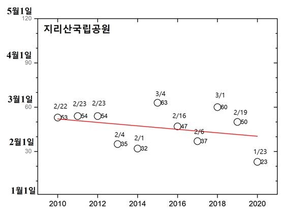 월출산국립공원 도갑사에서 지난해보다 6일 빠른 1월 21일 북방산개구리의 산란이 확인, 무등산국립공원 장불재의 경우 지난해보다 37일 이른 1월 24일 산란이 확인됐다.