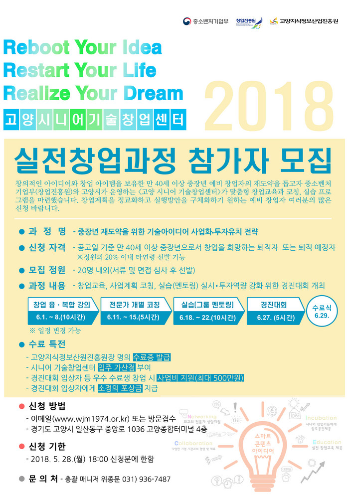 문의 고양 시니어 기술창업센터(031-936-7487), 고양지식정보산업진흥원 홈페이지에서 상세하게 확인할 수 있다.