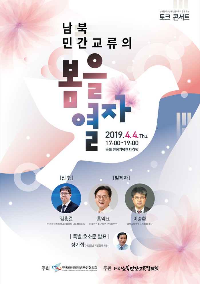 (사)민족화해협력범국민협의회(대표상임의장 김홍걸)와 (사)남북민간교류협의회(상임대표 이한용)는 4일(목) 오후 5시 국회 헌정기념관에서 '남북 민간교류의 봄을 열자!'를 주제로 토크콘서트를 열어, 북핵문제 해결과 남북교류재개를 위한 해법을 모색한다.