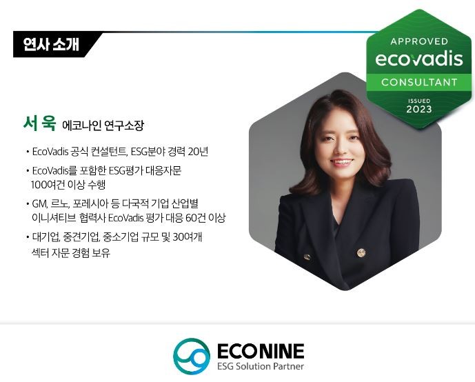 이번 전담 강사는 서욱 에코나인 대표(연구소장)가 맡는다. 그는 EcoVadis 공식 컨설턴트로서 ESG 분야에서 20년 이상의 경력자다. 그는 EcoVadis를 포함한 ESG 평가 대응 자문을 100여건 이상 수행능력을 토대로 GM, 르노, 포레시아 등의 다국적 기업 산업별 이니셔티브 협력사로 EcoVadis 평가 대응 60건 이상 경험을 갖추고 있다.