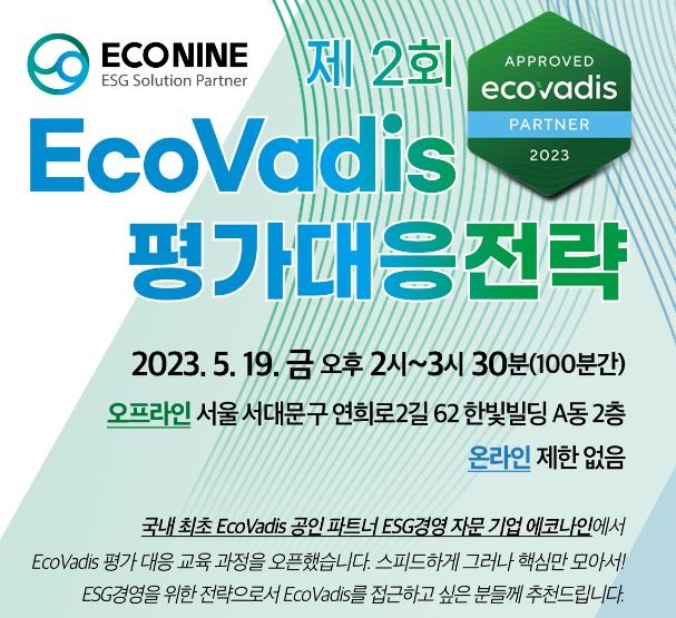 EcoVadis는 글로벌 공급 업체의 환경 및 사회적 영향을 평가하는 글로벌 지속가능성 평가 협업 플랫폼으로, 전 세계 160개국, 200여개 산업에 걸쳐 10만여개 이상의 기업들을 평가하고 있다. 에코나인은 EcoVadis의 평가 자문을 통해 기업들의 ESG 경영을 지원하고, 다양한 기업들이 높은 등급을 획득할 수 있도록 도움을 주고 있다.
