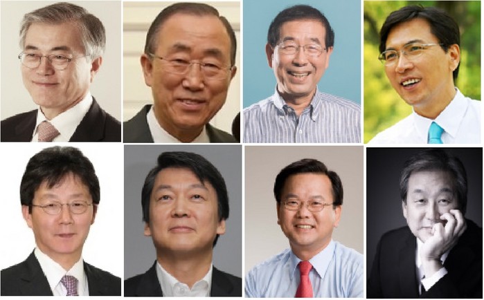 | ▲(사진 윗쪽 좌측부터) 문재인, 반기문, 박원순, 안희정, 유승민, 안철수, 김부겸, 김무성 정치인들이 2017년 대통령 선거에 어떤 식으로 자신의 입지를 부각시키고, 대선출마의 확고한 명분으로 국민들의 지지를 끌어낼 묘수찾기에 돌입된 상태다. |