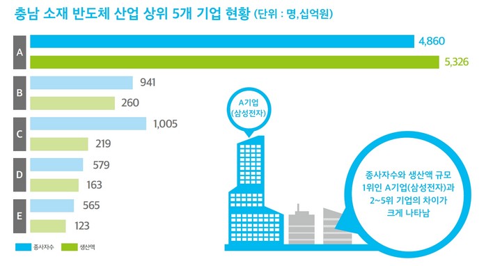 현재 반도체 관련 사업체는 주로 천안, 아산 지역에 위치해 있는데, 반도체 산업 상위 5개 기업의 총 생산액 중 1위인 삼성전자가 차지하는 비중은 85.6%로 나타났다.