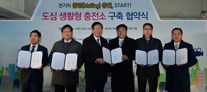 한전은 2월 9일 용산역 아이파크몰 주차장에서 도심 생활형 전기차 충전소 1호 준공식을 개최하고, 한국철도공사, 이마트, 홈플러스, 농협하나로유통과 전기차 충전인프라 구축협력 MOU를 체결했다.