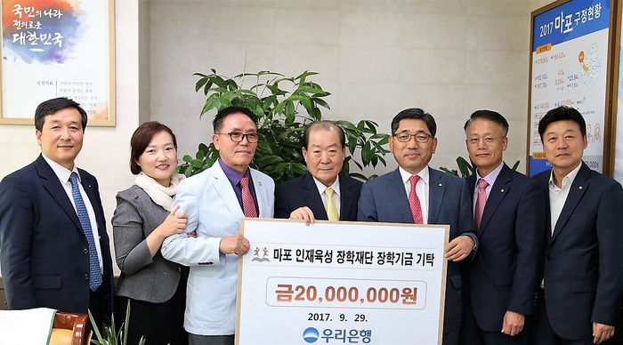 [환경데일리 이수진 기자]9월 29일 오후, 마포구청에서 우리은행이 마포인재육성장학재단의 장학기금으로 2000만원을 기탁하고, 박홍섭 마포구청장(사진 왼쪽 네번째), 권오범 마포인재육성장학재단 이사장(왼쪽 세번째) 및 조운행 우리은행 부은행장(오른쪽 세번째)과 우리은행 직원들과 함께 기념사진을 찍었다.