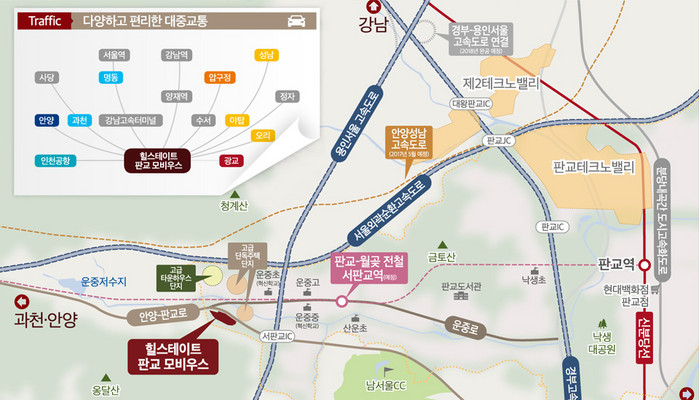 교통환경도 편리하다. 인근에 서판교IC가 있어 고속도로 진출입이 용이하며 서울외곽순환도로, 용인서울고속도로, 경부고속도로 등을 이용하기 편리하다. 2018년 경부~용인서울고속도로가 연결되면 교통 편의성은 크게 향상될 것으로 예상된다.