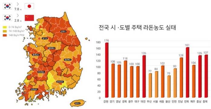 | ▲전국 라돈물질 분포도. 베터라이프 발췌 |