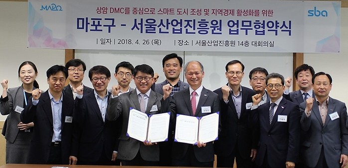 [환경데일리 이수진 기자]서울시 마포구(구청장 박홍섭)는 지난 26일 서울시 산하 중소기업 지원기관인 서울산업진흥원(SBA)과 '상암DMC를 중심으로 스마트 도시 조성 및 지역경제 활성화를 위한 업무협약(MOU)'을 체결했다.