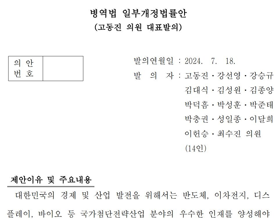 고동진 의원(국민의힘)은 "이번 발의 배경은 우수 인재의 안정적 육성 및 확보에 장벽이 있었다."며 "국가첨단전략산업 분야의 병역지정업체(대기업, 연구기관 및 연구개발 업체 포함)를 의무 지정과 동시에 해당업체의 종사자가 산업기능요원으로 편입하거나 전문연구요원이 병역지정 업체에 전직하는 '병역법 일부개정법안'"이라고 했다.