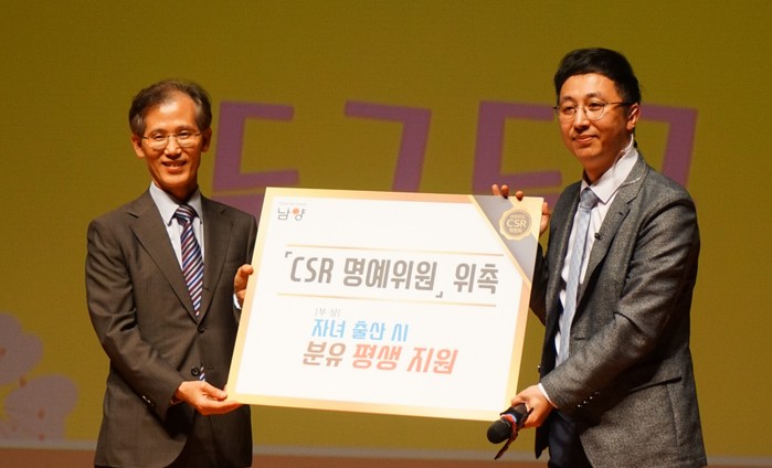 6월 14일에 광명시민회관에서 열린 '남양분유 임신육아교실'에 남양유업 이정인 대표이사가 깜짝 방문해 한상규씨의 아름다운 선행을 격려하고 남양유업 CSR 명예위원 위촉과 함께 부상으로 자녀 출산 시 남양유업 분유 평생 지원을 약속했다.
