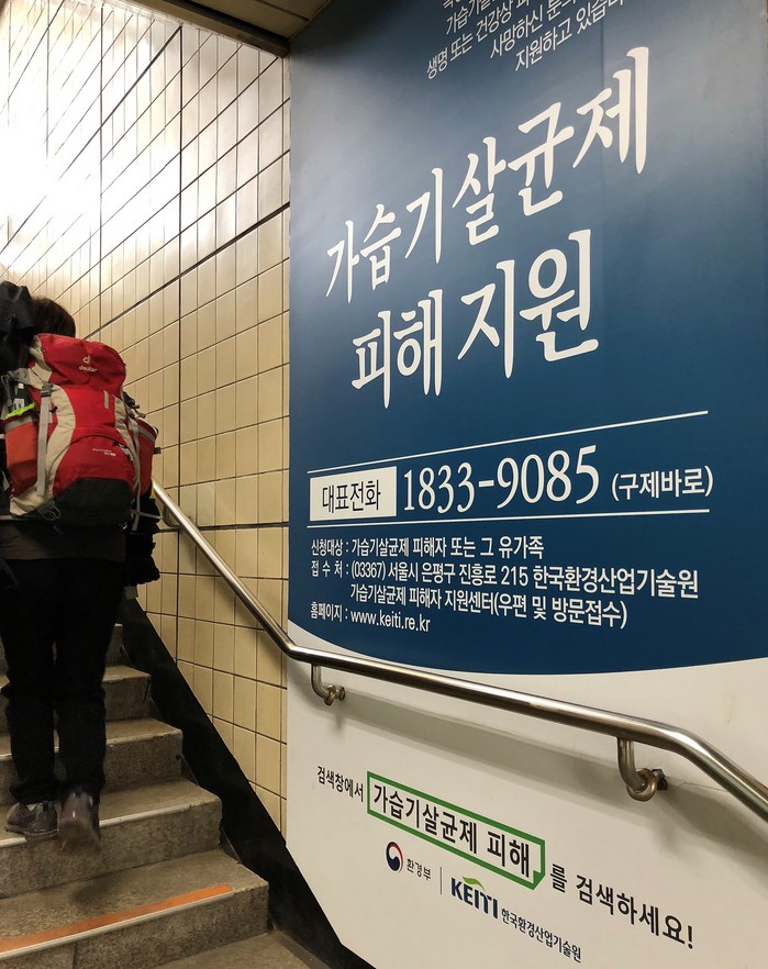 | ▲가습기살균제 피해를 신속하게 정확하게 구제 하기 위한 홍보 안내판이 서울교통공사 불광역에 걸려있다. 사진 박노석 기자 |