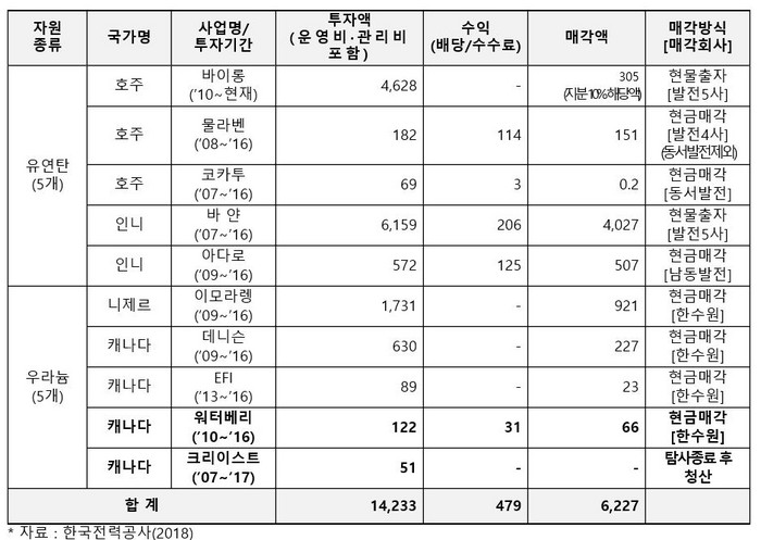 캐나다와 니제르에 위치한 5개의 우라늄 광산 사업은 2623억원이 투자됐지만 수익은 31억원에 그쳤고, 한수원에게 1237억 원에 매각됐다.