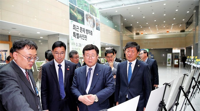 | ▲국회 로비에서 열린 병해충 특별사진전에 위성곤 의원, 설훈 국회농해수위원장, 라승용 농진청장이 관계자로부터 사진설명을 듣고 있다. |
