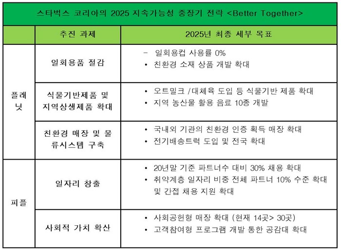스타벅스의 이번 지속가능성 중장기 전략은 '환경' 문제에 초점을 맞춰 진행됐던 기존 캠페인 외에도 '상생' 및 '채용' 등으로까지 그 범위를 확대하며 지속 가능한 미래를 위해 고객 및 지역사회와 교감하며 동반 성장한다는 취지로 마련됐다.