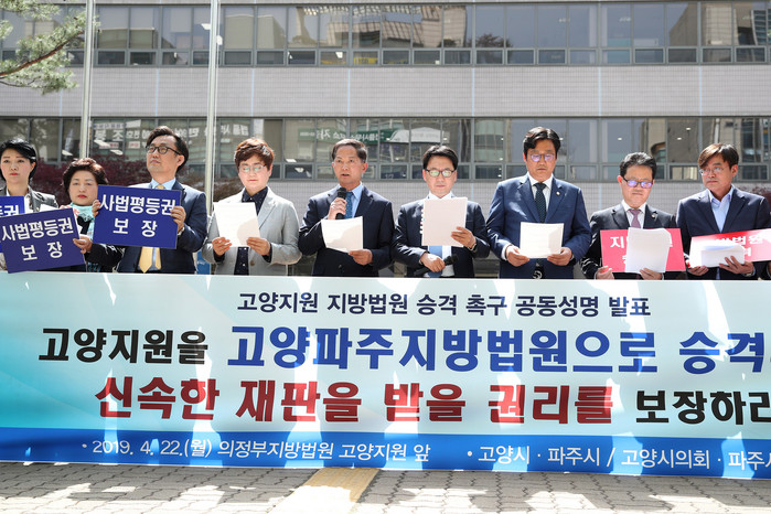 [환경데일리 이수진 기자]'사법서비스 소외지역'인 150만 고양.파주시가 권리를 찾고자 뭉쳤다. 22일 법의 날을 맞아, 고양·파주시는 고양지원의 지방법원 승격과 가정법원 설치를 촉구하는 공동성명을 발표했다.