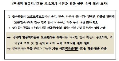 이어 "외래 멸종위기동물들이 보호 관리되지 못하고 폐사되는 것은 매우 안타까운 일"이라며 "이미 (충남 서천) 국립생태원 본원에 외래종에 대한 전염병관리 진단 기술이 확보돼 있어 밀수된 외래 멸종위기종에 대해서도 충분히 관리가 가능하고, 국민들에게 전시하기도 용이하기 때문에 연구용역 결과대로 국립생태원에서 보호센터를 운영해야 한다."고 강조했다.
