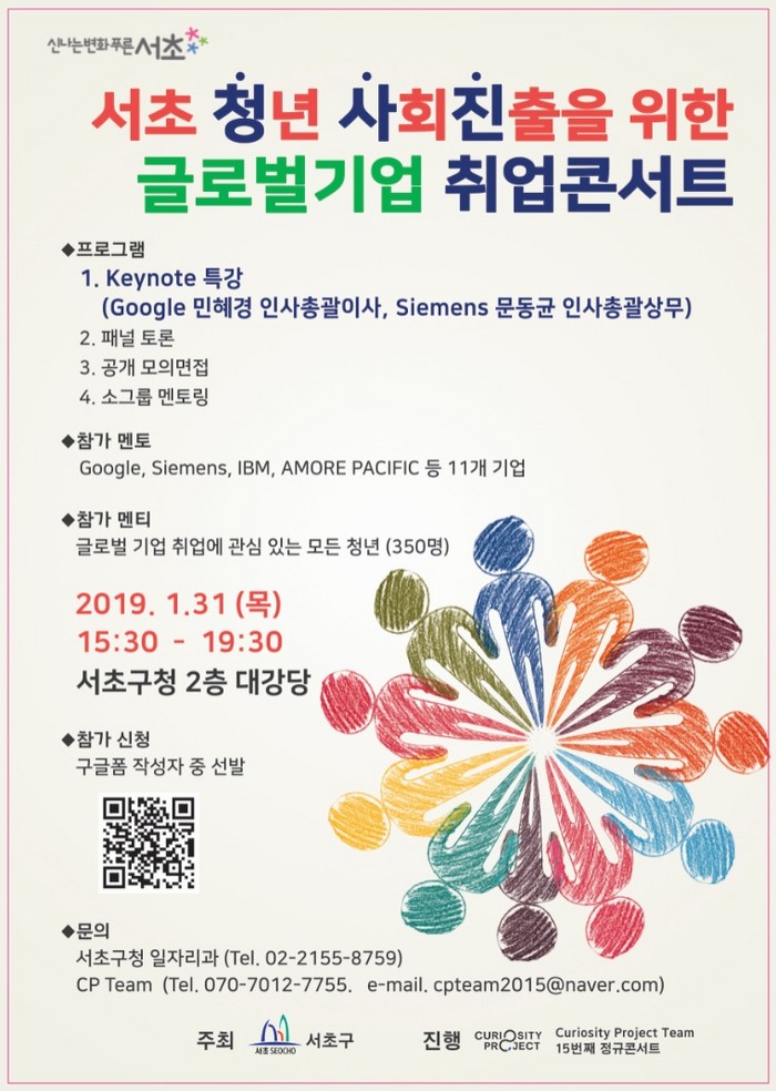서울 서초구가 청년들의 사회진출을 돕는 '서초 청사진 프로젝트'의 일환으로 설을 앞두고 31일 구청 대강당에서 11개 글로벌기업 인사담당자와 현직 재직자들이 입사 꿀팁을 알려주는 '글로벌기업 취업콘서트'를 연다.