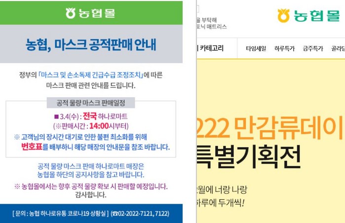 보다 많은 국민들이 공평하게 마스크를 구매할 수 있도록 반복 구매 등을 자제해 줄 것을 당부했다. 각 지역별 하나로마트 위치 등 기타 자세한 사항은 농협하나로유통(www.nhhanaro.co.kr)와 농협몰(www.nonghyupmall.com)를 통해 확인할 수 있다.