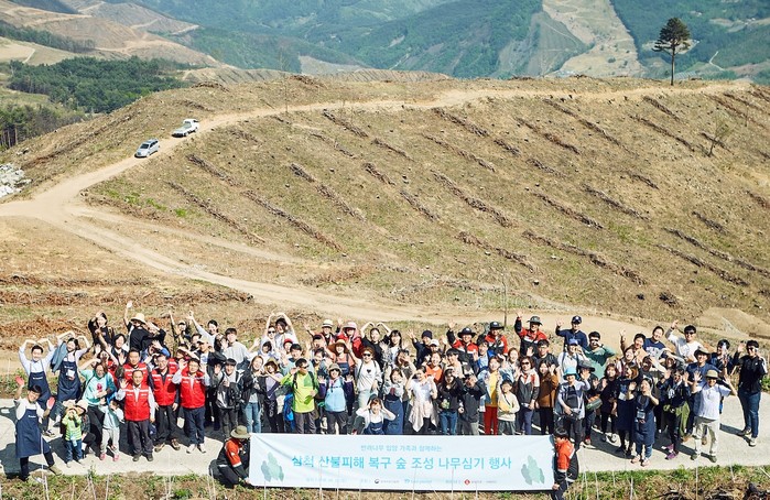[환경데일리 김영민 기자]축구장 332개 면적이 소실된 강원도 삼척 도계읍 일대의 산불 피해 지역에 시민들의 참여를 통한 '산불 피해 복구 숲'이 28일 조성됐다.