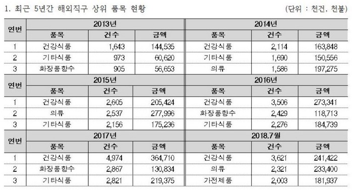 강병원 국회의원은 11일 관세청 국감에서 수입 금지된 건강위해식품이 해외직구 온라인 쇼핑몰을 통해 국내 유통되고 있는 상황을 지적했다. 더불어 수입금지물품의 국내유통을 차단하기 위해 관세청이 통관 단계 뿐 아니라 온라인 단속도 철저히 할 것을 주문했다.최근 5년간 해외직구 품목별 현황자료를 보면 국내 반입되는 물품 중 건강식품의 비중이 가장 높은 것을 알 수 있다.