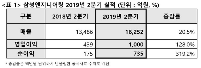 삼성엔지니어링은 26일 잠정실적공시를 통해, 2019년 2분기 매출 1조 6252억원, 영업이익 1000억원, 순이익 735억원을 기록했다고 밝혔다.(한국채택국제회계기준 연결). 전년동기대비 매출은 20.5% 증가했고, 영업익, 순익도 각각 128.0%, 319.2% 증가했다. 이로써 삼성엔지니어링은 매출 2조 9770억원, 영업익 2190억원, 순익 1775억원으로 2019년 상반기 실적을 마감했다.